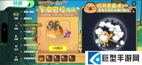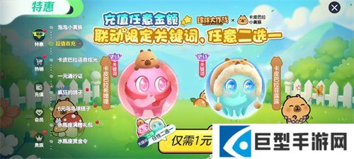 1月23日起,仅需 1元即可从「卡皮巴拉希哩哩」或「卡皮巴拉菲露露」中任选其一,6元续充再得另一款。累计7元带走两款呆萌联动皮肤,并解锁连续登录豪礼,累登2天立得「龙晶*66」、更有专属炫光等超值好礼惊喜获取!