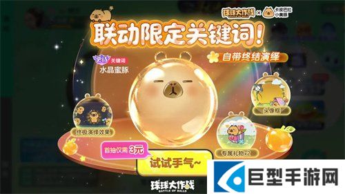 联动寻宝于1月23日至3月5日限时开启,获取传说关键词「水晶蜜豚」及专属超绝终结演绎!透明水晶中封印佛系小黄豚,终结时刻肌肉豚霸气登场,力量感爆棚,快来游戏中秀出你的身材!