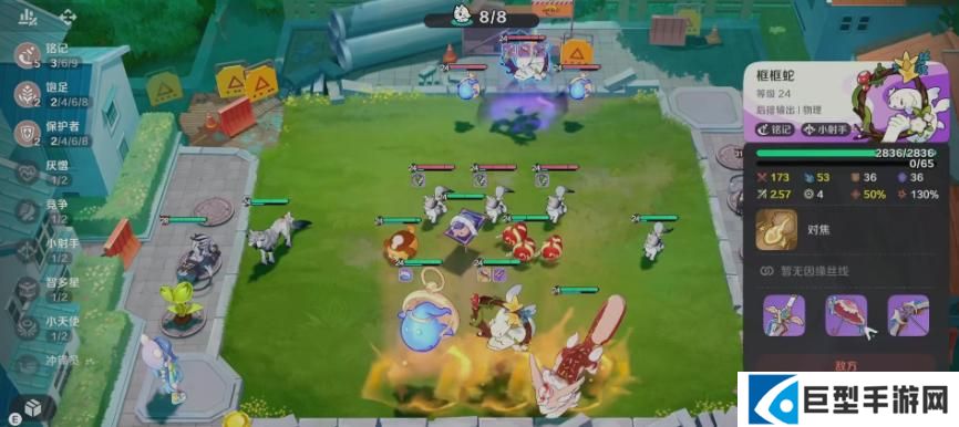 如果框框蛇跟攻击目标之间的距离大于两格的话,那么后期会有一定的加成可以进行提升,所以像框框蛇继续输出的话,远程能力会更高一些。如果大家想要用它更多能力的话,这里的羁绊是一定要触发的,它能够达到8羁绊效果的时候,能力会有很大百分比的提升,比如这里攻击力上面就会有40%的提升,除了攻击加成之外,还有额外的百分之百在属性上面有一定的提升,技能方面要用他的技能,最
