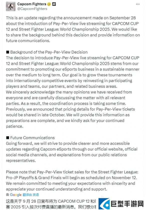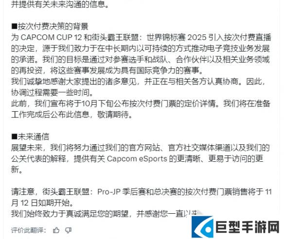 面对来自社区的批评声浪,卡普空官方已就此争议作出了正式回应。官方在声明中明确表示,不会改变收费观赛的既定决策,并重申此举是为了确保其电子竞技业务能够获得长期、稳定的资金支持,从而实现可持续的健康发展。官方同时指出,关于付费门票的具体价位等进一步信息,将在未来适当时机向公众详细公开。