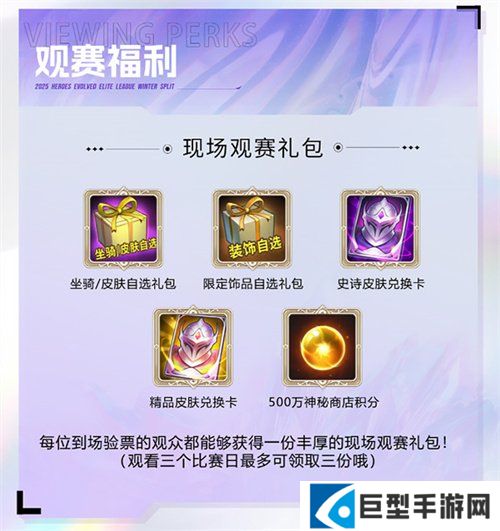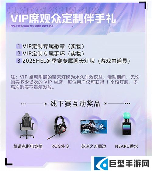 本届线下赛还有超多观赛福利等待着各位!每位到场验票的观众都能够获得一份丰厚的现场观赛礼包!若连续观看 1 月 9 日 - 11 日三个比赛日,最多可领取 3 份,福利可叠加!VIP 席观众除通用礼包外,还将获赠VIP 定制伴手礼套装,兼顾实物收藏与游戏体验!