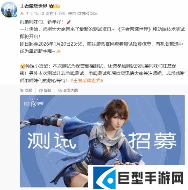 近日,《王者荣耀世界》官方宣布,移动端技术测试即将开启!2026年1月5日起至2026年1月20日23:59,前往游戏官网查看测试招募信息,有机会被选中,本次测试为保密删档测试。