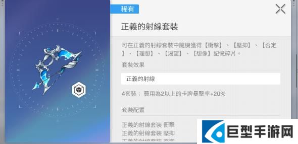 如果喜欢两费以上的卡牌,就不要错过正义的射线套装,就有20%的暴击率加成,可以让高费卡的爆发更加的稳定。还有对应不同的属性套装,例如秩序的弹药套装,还有虚无的禁品套装。用来消灭敌人就可以直接强化虚无输出,拥有比较出色的针对性。两件套主要侧重的是基础属性,又或者是特殊的增益,例如黑翼套装可以提升12%的攻击力。想要堆暴击伤害,可以选择有25%爆伤的执行者道具套装。想要玩辅助,可以选择有12%hp上线的治愈者终极套装。