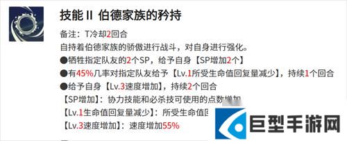 伯德家族的矜持这个技能是需要兰吉尔斯保持着伯德家族的骄傲去和对手战斗,该技能主要作用就是强化自身的能力了,使用该技能后,兰吉尔斯可以直接牺牲指定2名队友的sp,将牺牲队友的sp赋予到自己的身上,且还有45%的几率给队友附加上所受生命值回复量减少的效果,自身可以被赋予速度增加效果,sp点数也会随之增加。