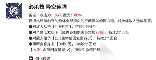 异空连弹是兰吉尔斯的必杀技能,该技能的攻击力和魔力均为86%,该技能使用后,兰吉尔斯会向敌人方向投掷出能够将所有接触的物品全都给消失的空间魔力球,空间魔力球在接触到敌人时,还会给敌人附加上回复阻断的效果和生命值回复量减少的效果,给我方全部的队友附加上属性克制伤害量增加20%的效果,最主要的是该技能可以直接将自身的Ddbuff给阻断。