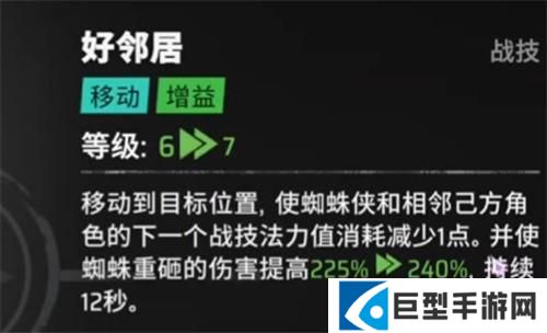 这是一个兼具位移与增益的多功能技能。使用后蜘蛛人可快速移动至指定位置,并为自身及周围队友提供下回合战技法力消耗降低