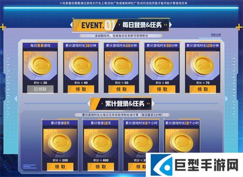 活动1:每日登录&任务,活动期间内完成每日登录和时长任务可获得活动积分,累计登录天数及时长任务,还可获得更多积分,大家请注意,每天最多累计2小时,合理作息,健康游戏!