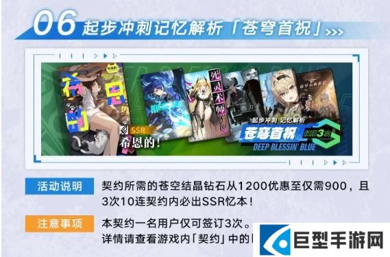 6、起步冲刺记忆解析「苍穹首祝」:契约所需的苍空结晶钻石从1200优惠至仅需900,且3次10连契约内必出SSR忆本,仅可签订1次。