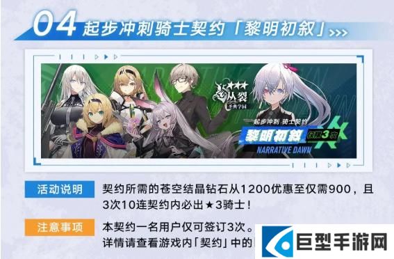 4、起步冲刺骑士契约「黎明初叙」:契约所需的苍空结晶钻石从1200优惠至仅需900,且3次10连契约内必出3星骑士,仅可签订1次。