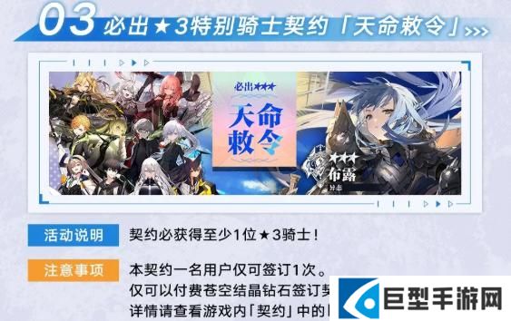 3、必出3星特别骑士契约「天命敕令」:契约必获得至少1位3星骑士,仅可签订1次,可以付费苍空结晶钻石签订契约。