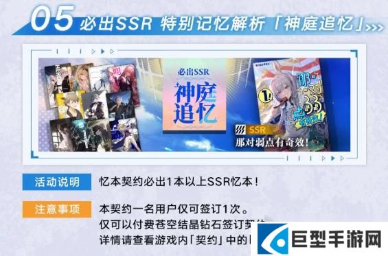 5、必出SSR特别记忆解析「神庭追忆」:忆本契约必出1本以上SSR忆本,仅可签订1次,可以付费苍空结晶钻石签订契约。