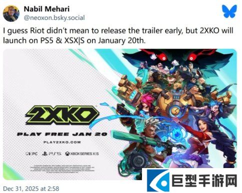 开发商拳头游戏在其意外发布但现已转为私密的视频中称,其免费格斗游戏《2XKO》将于2026年1月20日离开抢先体验,正式登陆PC,Xbox Series和PS5平台。