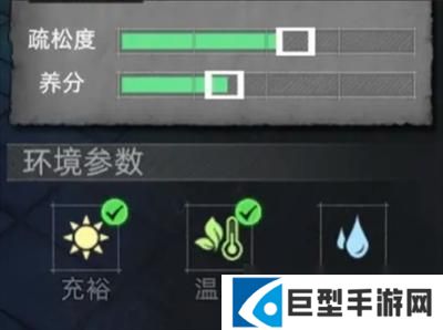 这里放「泥土」是因为它的疏松度和营养进度条是一致的方便调节,而且不算低在 20% 左右,这里就不放图了,大家自己游戏里看。