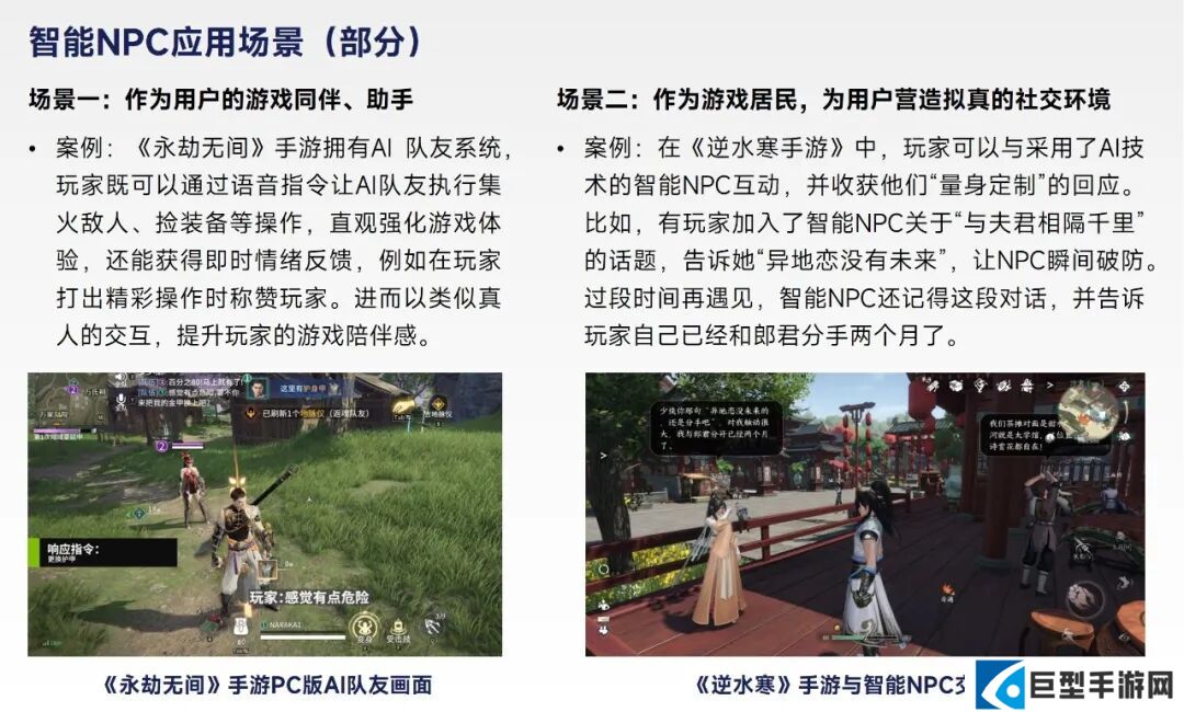 AI依然是游戏产业的发展重点。从头部企业布局来看,AI运用正呈现向广度、深度同步推进的特点——广度上,游戏营销、游戏资产生成、游戏测试、小程序游戏等诸多领域,均可借力AI降本增效;深度上,AI进一步提升游戏体验,带来更多新鲜玩法,智能游戏陪玩、智能NPC是其典型代表。