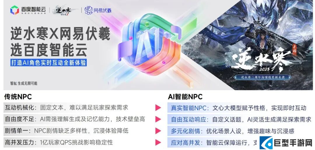 在游戏体验方面,网易伏羲与百度智能云合作,通过文心Character大模型实现智能NPC交互体验,支持自由互动响应、多元化剧情,进而增强用户趣味性与沉浸感。在1亿玩家同时在线挑战的高并发场景中,系统依然表现出卓越的稳定性与性能,推动虚拟角色深度进化。