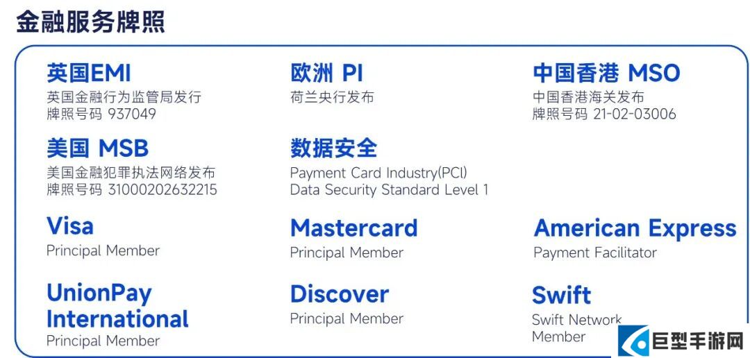 除此之外,在游戏企业普遍高度关注的资金安全层面,ONERWAY也有较佳的保障能力。 ONERWAY拥有英国EMI、欧洲PI等金融服务牌照,覆盖多个主流国家和地区,这意味着于ONERWAY中转的资金,始终受到地区金融监管的保障。
