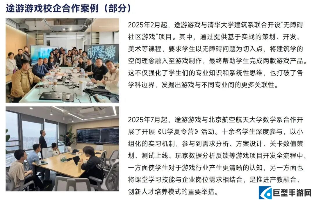 途游游戏的人才积累,既代表着其自身长期主义战略的落地与跨品类转型的底气,也支撑企业进行更多差异化尝试。一方面,途游游戏通过校企合作,发掘高潜力人才,先后与清华大学、北京航空航天大学、香港大学等院校合作,开设实战课程或实习项目,为学生提供 产教研一体化的培养路径。值得关注的是,途游游戏的校企合作项目不局限于研发、美术等与游戏强关联性的专业,也通过更多公益性项目,发掘游戏与不同学科间的关联性,扩大创意人才的来源渠道,例如与清华大学建筑系联合开设的“无障碍社区游戏”课程,引导学生将建筑学的空间理念与游戏创意相结合,从而打破学科边界。另一方面,途游游戏也在持续关注内部人才发展,通过创立“途游学堂”,从职业素养、专业技能、领导能力三个维度为企业人才提供系统化培训,帮助人才进一步提升自身技能。