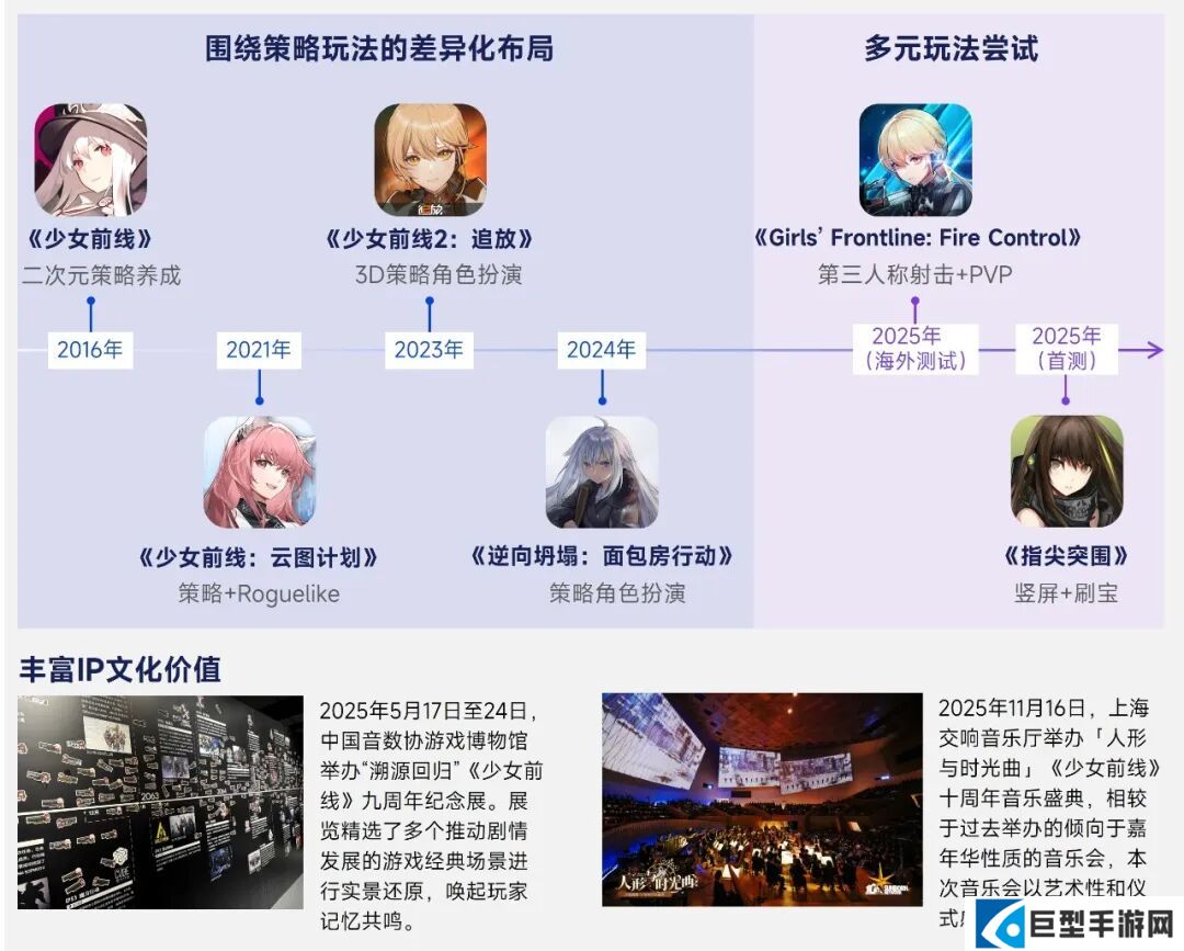 原创游戏IP的塑造是散爆网络的核心潜力,旗下头部IP“少女前线”已发展近十年,积累了大量用户群体。散爆网络对于“少女前线”IP的塑造围绕构筑多元产品矩阵和提升品牌文化价值两方面展开。一方面,围绕IP推出多元玩法的系列产品——从早期围绕初代作品《少女前线》,对战术策略玩法进行差异化布局,随着技术迭代与用户游玩偏好转变,散爆网络也逐步尝试PVP玩法及轻量级创新等与过往品类差异较大的模式,进一步充实产品矩阵。另一方面,持续丰富IP的文化价值,不仅通过推出动漫、衍生品等内容和产品拓展IP影响力,还借助举办音乐会、纪念展等形式实现线上与线下的联动,触达并凝聚核心玩家群体,加深IP与玩家间的情感链接。基于原创游戏IP塑造,使IP生命力得以延长,也使散爆网络在未来依然具备持续增长的潜力。