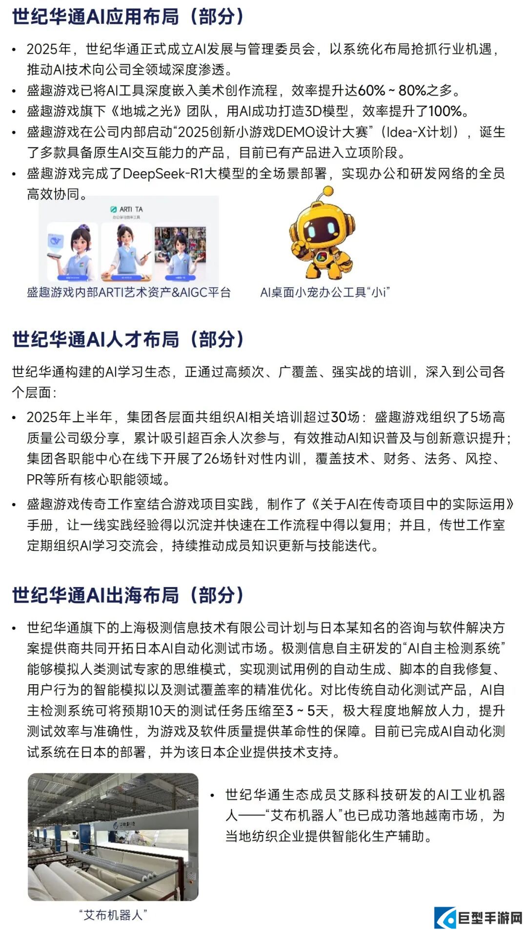 AI能力的快速构建同样成为世纪华通具备未来增长潜力的关键原因,世纪华通围绕AI应用、AI人才与AI出海三条主线持续加码,为业务效率提升与全球化拓展奠定基础。在AI应用方面,盛趣游戏已将AI深度嵌入美术、研发、测试、客服和办公协同等全流程,通过内部AI小程序游戏大赛、自研工具与大模型应用推动AI原生内容落地,并通过外部合作布局AI安全风险的防护,Century Games和点点互动也采用“AI生成+人工优化”模式,实现了内容生产效率的提升;在AI人才方面,公司通过新增AI岗位、开展系统化的内部AI培训,并将AI工具应用效果纳入KPI考核,推动AI能力从认知普及走向实际生产力;在AI出海方面,旗下极测信息的“AI自主检测系统”已与日本合作伙伴共同拓展当地市场,实现智能用例生成与脚本自修复等能力输出,此外,世纪华通生态企业的AI机器人亦已落地东南亚部分市场。