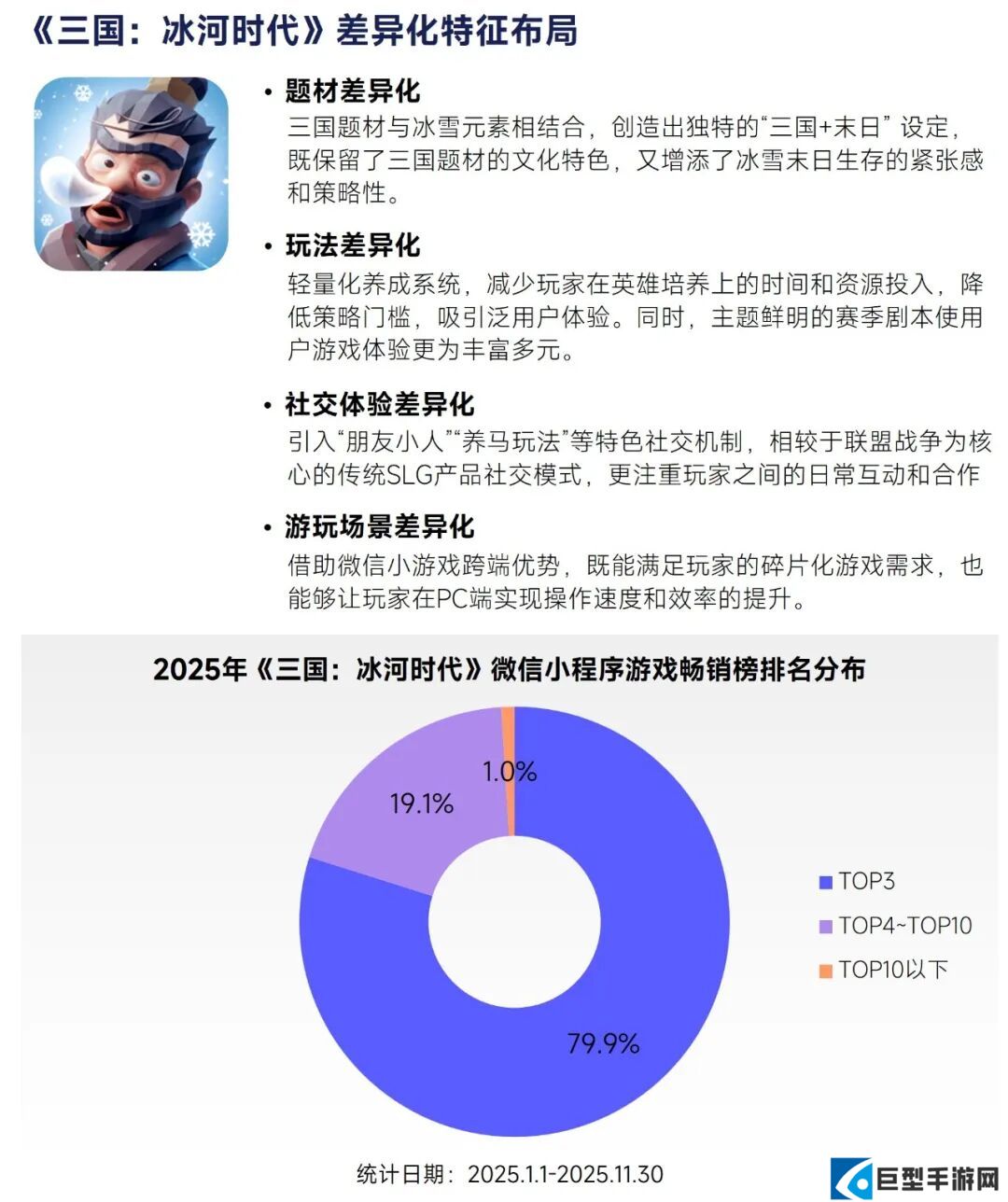 途游游戏在策略类(含SLG)赛道通过区别于传统策略类(含SLG)产品的差异化布局,丰富品类多元化布局,夯实企业“基于全球范围、围绕策略及休闲两条产品线自研自发、致力成为一家全球领先的数字化娱乐企业”的发展基石。以旗下产品《三国:冰河时代》为例,该产品的差异化特征在于:第一,将三国题材与冰雪元素结合,并融入轻量化玩法和社交体验,实现用户群体的拓展;第二,借助小游戏天然跨端属性,适配用户多元游玩场景;第三,通过赛季制解锁独特的地图、机制和目标,保持用户长期新鲜感。上述差异化布局,使《三国:冰河时代》在用户结构和游戏体验上均取得突破:一方面,轻量化的玩法和社交元素吸引大量泛用户,女性用户占比较同品类产品更高,打破了策略类(含SLG)产品以男性占绝对主导的用户结构;另一方面,跨平台游玩场景和赛季制内容迭代作用于用户体验,通过体验升级促进用户长期留存。截至2025年11月30日,《三国:冰河时代》长期保持在微信小程序游戏畅销榜TOP3位置,并有望随着赛季内容不断丰富、全球化进程持续深化,迎来更大的发展空间。途游游戏差异化布局策略类(含SLG)产品,代表着自身转型的清晰路径与对市场趋势的精准把控,同时意味着深耕单一品类的厂商可通过循序渐进的积累实现跨品类突破、拓宽业务边界,对企业的战略发展和行业的影响都具有重要意义。
