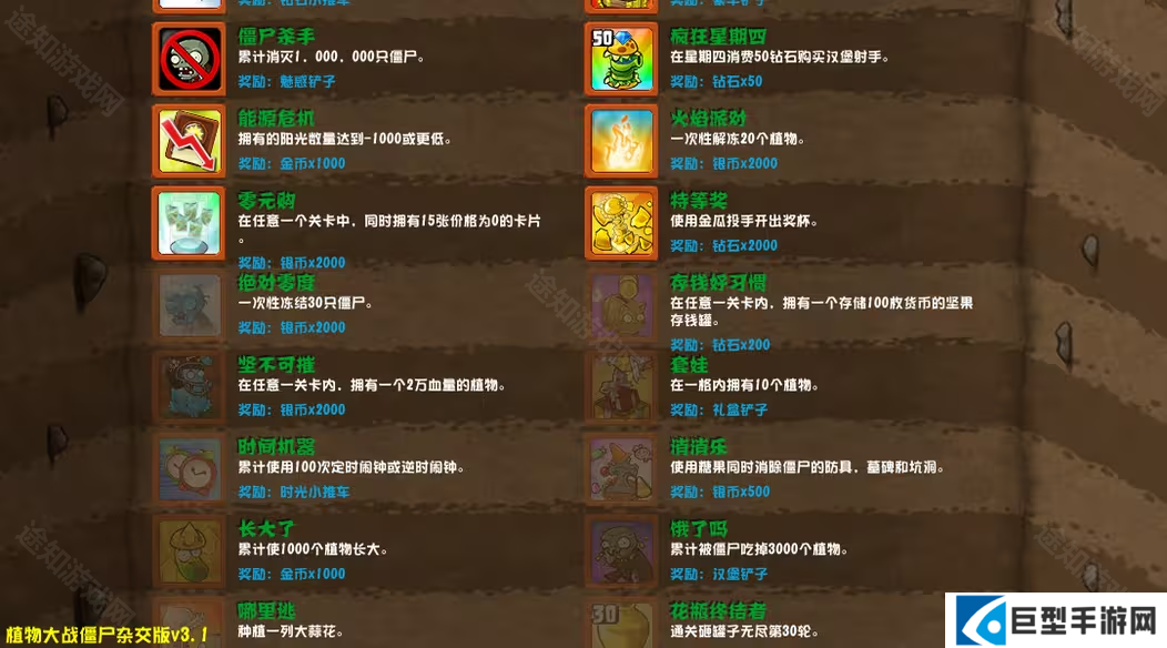 全新的成就系统,达成成就后可以获得银币、钻石和植物卡牌等奖励。
