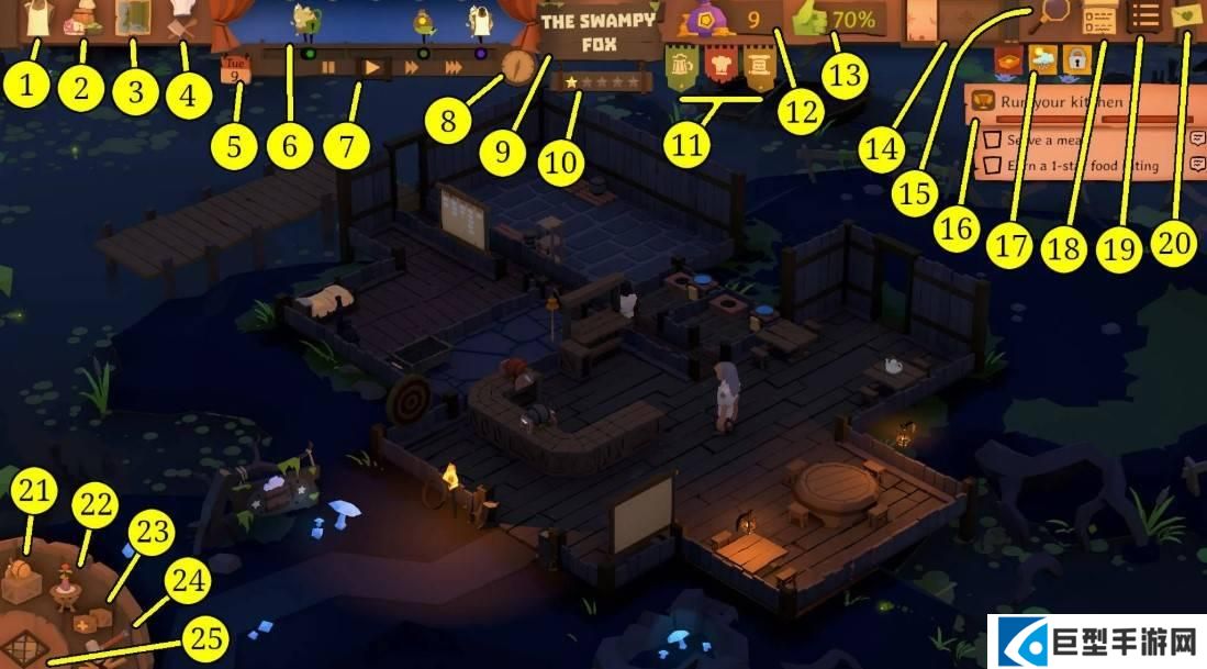 1、雇用员工:此按钮用于雇用新员工。您每周只有这么多申请,但您可以花费金币来解锁更多申请人;每次使用此选项,获得新申请人的黄金成本都会增加。每周都会产生新的申请人。2、存储概述:此按钮显示您在酒馆中拥有的所有产品和消耗品。3、世界地图:这会显示地图,您可以在其中从商店购买酒馆的食物、饮料和其他物品。4、酒馆菜单:这向您显示了您可以出售给顾客的食物和饮料。5、日历: 这会显示一周中的某一天以及您经营酒馆的天数。您可以单击日历打开事件日志并查看发生了哪些重大事件,例如交付或特殊事件。6、事件跟踪器:此轨道向您展示重要事件何时发生。其中包括您的酒馆开业或关闭、待付款、送货、商家到来(如适用)、新员工申请以及故事书等特殊活动。7、时间控制:这些按钮可让您暂停游戏或加快游戏时间。8、时钟: 正如您所料,这显示了当前的游戏时间。9、酒馆名称:屏幕顶部中央的标语牌显示您的酒馆名称。您可以右键单击该标志来更改酒馆的名称或暂时关闭您的酒馆,只要您愿意。请记住,当酒馆关门时,您仍然需要支付员工工资!10、酒馆评分:酒馆的总体评分由酒馆名称下方的星星表示。获得更高的评级可以在该场景中解锁新物品并吸引更高级别的顾客。大多数场景对您可以到达的星星都有最大上限。11、酒馆进度横幅: 酒馆评级右侧的旗帜可以突出显示,以显示您的每项服务的级别:食物、饮料、住宿、服务等。您可以通过将鼠标悬停在旗帜上来了解如何提高每个部门的星级。12、金: 这显示了您目前有多少钱。如果这变成负数,那么在您破产并不得不加载较旧的储蓄之前,您只有不到一天的时间赚到足够的钱来再次使其变正。13、顾客满意度:这表明参观您酒馆的顾客有多满意。单击它即可按类别查看他们的满意度明细;这是识别酒馆特定元素的任何问题的好方法。14、顾客吸引板:顾客吸引力板一旦解锁,您就可以大致了解在不久的将来将有多少顾客到达。您还可以使用它来邀请顾客团体以获得额外的钱。15、大气叠加:氛围叠加工具可让您查看酒馆在消防安全、清洁度、装饰等方面的状态。16、通知和目标:您当前的目标始终列在屏幕的右上角。如果发生重大事件(例如火灾或故事书),这里会弹出一个窗口,让您知道它。17、警告:有关您的酒馆的任何重要状态消息(例如库存不足或受到侵扰的影响)都会显示在这里。您还可以查看此处列出的方案特征,这些特征解释了您当前正在工作的任何特殊条件。18、侧面通知:按下此按钮将折叠“通知”窗口。19、暂停菜单: 此按钮将弹出暂停菜单,您可以在其中保存游戏、离开酒馆等。20、发送反馈:按下此按钮会弹出一项功能,允许您向开发人员发送反馈。21、建筑: 此按钮可让您为酒馆添加新的家具和装饰品。22、设计:此按钮会调出“设计”功能,允许您设计自己的装饰品。23、克隆工具:此按钮允许您复制和粘贴酒馆中的家具和装饰品。(很遗憾,您无法复制整个房间。24、拆除:此按钮可让您进入拆除模式并摧毁家具和装饰品。25、建造房间:此按钮允许您通过选择楼层类型、添加内墙和添加门来布置酒馆中的房间。
